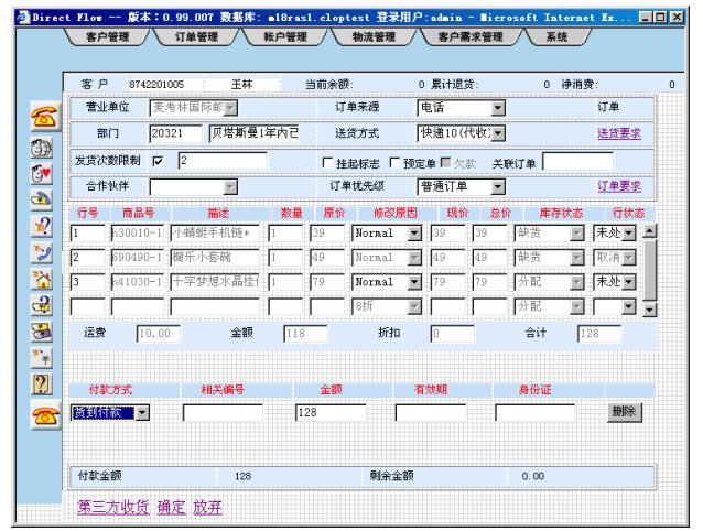 如果客戶訂單采用匯款支付方式,當(dāng)財(cái)務(wù)部門收到到款通知,并輸入CRM系統(tǒng),系統(tǒng)會(huì)向發(fā)貨部門下達(dá)發(fā)貨工單。如果客戶訂單采用一卡通支付方式,系統(tǒng)確認(rèn)支付無(wú)誤就立即向發(fā)貨部門下達(dá)發(fā)貨工單,整個(gè)過(guò)程全部自動(dòng)化。