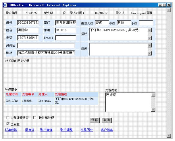 客戶向麥考林定購(gòu)商品的最常用途徑就是電話訂貨,客戶撥打麥考林服務(wù)熱線進(jìn)入客服系統(tǒng)。系統(tǒng)會(huì)根據(jù)客戶的主叫號(hào)碼對(duì)客戶進(jìn)行識(shí)別,如果識(shí)別成功,座席代表屏幕上會(huì)自動(dòng)彈出客戶資料和以往訂貨記錄;如果識(shí)別失敗,座席代表可以根據(jù)客戶通報(bào)的客戶代碼或姓名等信息查詢客戶資料。如果是新客戶,座席代表可以立即為他創(chuàng)建客戶檔案。