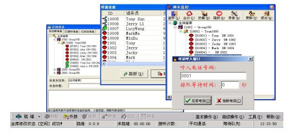所有線路、座席狀態(tài)、操作時(shí)長(zhǎng)的動(dòng)態(tài)監(jiān)視,動(dòng)態(tài)監(jiān)視呼叫隊(duì)列長(zhǎng)度,并能實(shí)現(xiàn)監(jiān)聽、強(qiáng)插、強(qiáng)拆、強(qiáng)制注銷控制功能。