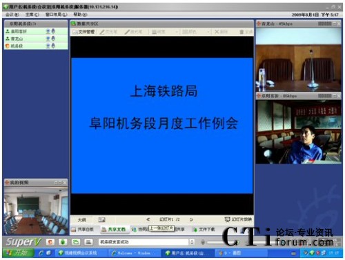 CTI論壇(ctiforum)08月06日消息: 日前,京九干線主力機務(wù)段——上海鐵路局阜陽機務(wù)段成功啟動視維Super-V視頻會議系統(tǒng)。阜陽機務(wù)段的領(lǐng)導(dǎo)和職工,每天早上8點上班后,第一件事情就是登陸視頻會議系統(tǒng),匯報前日工作情況、部署當(dāng)日工作內(nèi)容。已然,山大聯(lián)潤為上海路局阜陽機務(wù)段部署的阜陽機務(wù)段視頻會議系統(tǒng),成為鐵路部門必不可少的遠程溝通交流工具,在有效提高鐵路系統(tǒng)溝通效率的同時,保障了鐵路運輸?shù)陌踩瑯O大滿足了鐵路部門暑期運營業(yè)務(wù)對溝通和會議的需求。