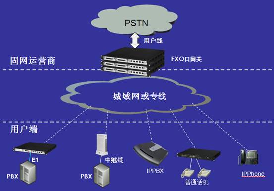 “固網(wǎng)IP化”方案無需軟交換,延用現(xiàn)有的數(shù)字程控交換機(jī)與業(yè)務(wù)支持系統(tǒng)作為核心網(wǎng)業(yè)務(wù)平臺(tái),只是在交換機(jī)外圍增加實(shí)現(xiàn)模擬/數(shù)字語音信號(hào)轉(zhuǎn)換成IP的VoIP網(wǎng)關(guān),并通過IP網(wǎng)絡(luò)實(shí)現(xiàn)與遠(yuǎn)程客戶終端設(shè)備的連接。遠(yuǎn)程的用戶端設(shè)備可以是傳統(tǒng)設(shè)備,如普通電話、傳真機(jī)或小型交換機(jī),也可以是基于IP的語音設(shè)備,如SIP電話、IPPBX等(如下圖所示)?梢詫(shí)現(xiàn)小區(qū)放號(hào)、企業(yè)直線電話、企業(yè)語音交換機(jī)接入等業(yè)務(wù)。