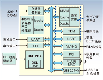 圖2演示了這種架構(gòu)的一個例子,即一款帶集成ADSL和VDSL2寬帶連接功能的SoC。該SoC具有一個工作在400MHz頻率的多媒體網(wǎng)關(guān)處理器,性能比以前產(chǎn)品提升了一倍。附加的硬件加速器和32位寬的存儲器接口進一步提升了該網(wǎng)關(guān)的聯(lián)網(wǎng)能力。