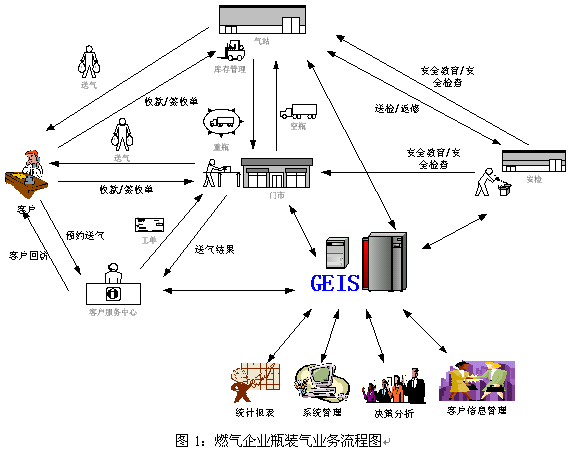 GEIS燃?xì)膺\(yùn)營管理信息系統(tǒng)的應(yīng)用是企業(yè)的長期發(fā)展的驅(qū)動(dòng)力,它是一套以客戶服務(wù)接觸中心為龍頭、以運(yùn)營生產(chǎn)流程管理為龍身、以經(jīng)營分析為龍尾的閉環(huán)信息處理系統(tǒng)。它由客戶服務(wù)中心子系統(tǒng)、門市業(yè)務(wù)子系統(tǒng)、氣站管理子系統(tǒng)、安全搶修平臺和管理與集成模塊組成。實(shí)踐的事實(shí)告訴我們,它起到保持客戶忠誠度、提升企業(yè)品牌影響力、提高業(yè)務(wù)運(yùn)作效率、加快業(yè)務(wù)經(jīng)營決策和促進(jìn)企業(yè)持續(xù)發(fā)展的作用。