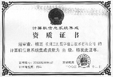按照《計(jì)算機(jī)信息系統(tǒng)集成資質(zhì)管理辦法(試行)》和《計(jì)算機(jī)信息系統(tǒng)集成資質(zhì)等級評定條件(試行)》,經(jīng)信息產(chǎn)業(yè)部計(jì)算機(jī)信息系統(tǒng)集成資質(zhì)認(rèn)證管理委員會(huì)審定,在不久前,信息產(chǎn)業(yè)部公布的計(jì)算機(jī)信息系統(tǒng)集成資質(zhì)證書企業(yè)名單中,杭州三匯數(shù)字信息技術(shù)有限公司獲得叁級認(rèn)證。