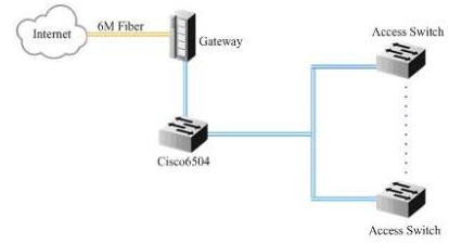 客房局域網通過一條6M的光纖接入CNC網絡,網關設備承擔了DHCP、NAT和流量限制等功能,同時在思科6504上安裝有安全板卡,對內部網絡安全進行加強和防御。由于每個客房有2~3個信息點,客房局域網總共有1300個左右的信息點。