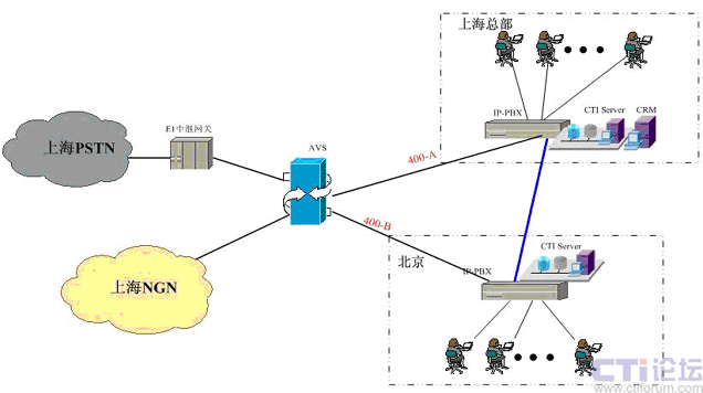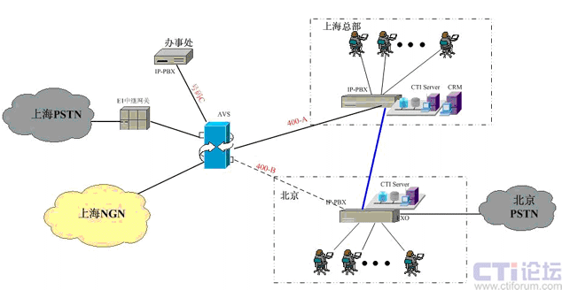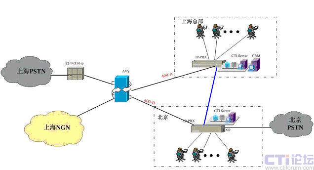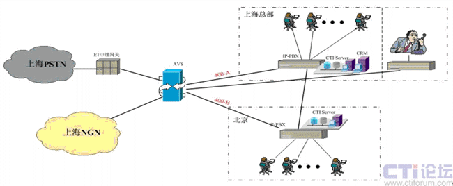 在上海采用傲威通信的AVS軟交換平臺(tái)實(shí)現(xiàn)VoIP呼叫系統(tǒng)的主叫識(shí)別,決定呼叫路由的選定。在上海和北京分別建設(shè)IP-PBX和CTI呼叫系統(tǒng),在各辦事處或分公司可根據(jù)選擇是否要建設(shè)坐席或普通電話(huà)系統(tǒng),所有節(jié)點(diǎn)的呼入呼出統(tǒng)一從上海出口實(shí)現(xiàn)出入。