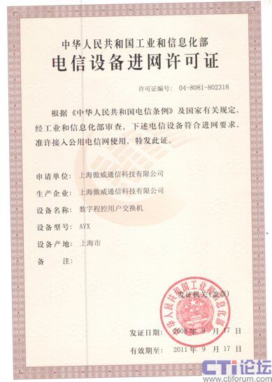 傲威通信AVX系列語音電話交換機(jī)獲得“電信設(shè)備進(jìn)網(wǎng)許可證”