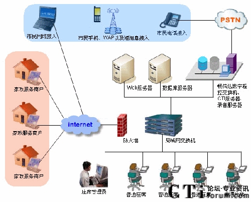 隨著國內(nèi)城市化地不斷加快,人口老齡化的加劇,人民群眾對家政服務(wù)需求也越來越旺盛,家政服務(wù)業(yè)的重要性也日益凸顯。為了規(guī)范家政服務(wù)市場、整合家政市場資源、培育家政服務(wù)示范性企業(yè),國家商務(wù)部、財務(wù)部于2009年4月下發(fā)了《關(guān)于推進家政服務(wù)網(wǎng)絡(luò)體系建設(shè)的通知》的149號文件,啟動了家政服務(wù)網(wǎng)絡(luò)中心體系建設(shè)的項目,并提出了具體的規(guī)范和要求。以此為起點,為更好地服務(wù)社會滿足人民群眾日益增長的生活需求而努力。自文件下發(fā)以來,我公司就組織專門的項目組,對家政服務(wù)行業(yè)具體業(yè)務(wù)需求的調(diào)研以及開發(fā)工作。公司利用多年的開發(fā)經(jīng)驗,經(jīng)過幾個月的努力,終于在8月份完成了暢信達家政服務(wù)網(wǎng)絡(luò)中心的全套建設(shè)方案。與其它系統(tǒng)固化的功能設(shè)計不同,該方案可以靈活地定制業(yè)務(wù)模塊,方便各地的家政公司根據(jù)本市的情況和需求,確定適合自身的業(yè)務(wù)流程。系統(tǒng)業(yè)務(wù)模塊完整地覆蓋了家政服務(wù)的業(yè)務(wù)范圍與重點。并將家政服務(wù)的業(yè)務(wù)分為營業(yè)系統(tǒng)、賬務(wù)系統(tǒng)、后臺系統(tǒng)等部分,貫穿了市民從訴求提交、工單派發(fā)、工單處理、財務(wù)結(jié)算到回訪反饋的各個方面。系統(tǒng)還提供了完善的報表模塊準(zhǔn)確反映業(yè)務(wù)和系統(tǒng)運營狀況,有力地支持對平臺進行運營管理工作。另外在方案設(shè)計上,除了滿足業(yè)務(wù)處理需要外,還充分考慮到系統(tǒng)的適應(yīng)性、穩(wěn)定性和處理的能力。首先為了滿足各地市對家政平臺的不同需求,公司專門推出了基于IBM服務(wù)器的和暢信達標(biāo)配服務(wù)器的兩種建設(shè)方案。暢信達標(biāo)配服務(wù)器方案可提供最低4模擬外線最多1條數(shù)字中繼(E1)接入,適用于初期規(guī)模較小且投資規(guī)模不大的客戶。而基于IBM服務(wù)器的方案,則主要是滿足業(yè)務(wù)量較大,同時對設(shè)備配置要求高的城市,以數(shù)字線接入為主。多種建設(shè)模式充分體現(xiàn)了方案的靈活性、可擴展性的特征,有效地減少了運營風(fēng)險,提升了個性化定制化服務(wù)的水平。其次,根據(jù)家政市場需求預(yù)測以及已開通家政服務(wù)網(wǎng)絡(luò)中心城市的實際運營情況,一個中型城市,預(yù)計電話開通之后,話務(wù)量平均每天近3000個,這就要求系統(tǒng)不但有穩(wěn)定的性能而且要有強大的處理能力。我公司從系統(tǒng)平臺構(gòu)建、業(yè)務(wù)流程設(shè)計、設(shè)備性能、組網(wǎng)設(shè)計等方面著手,為系統(tǒng)提供了足以確保安全穩(wěn)定運行的支持。