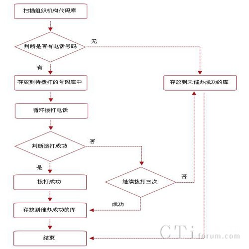 催辦業(yè)務(wù)負(fù)責(zé)完成語音提示。系統(tǒng)自動掃描組織機構(gòu)代碼庫,查詢當(dāng)日需要年檢的組織機構(gòu)代碼信息,對沒有電話號碼的存入到未催辦的組織機構(gòu)代碼庫中,有電話號碼的存入到待催辦的電話號碼庫中,并根據(jù)設(shè)置的時間撥打手機號碼,對于語音提示成功的,存放到相應(yīng)的庫中。催辦業(yè)務(wù)后臺功能包括:
