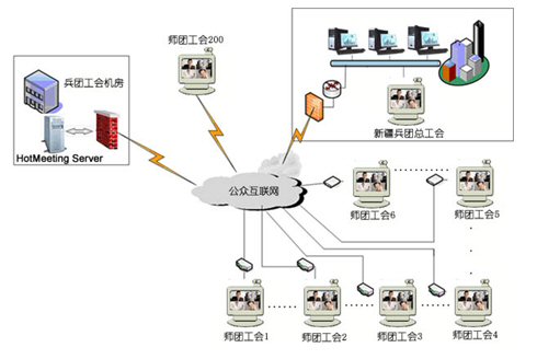 新疆建設(shè)兵團(tuán)工會(huì)下設(shè)有14個(gè)師工會(huì),111個(gè)團(tuán)場工會(huì).共有200個(gè)用戶同時(shí)參加視頻會(huì)議。中心服務(wù)器帶寬為100M光纖,各地終端通過網(wǎng)通2M寬帶接入,每個(gè)師、團(tuán)級(jí)會(huì)場都有自己獨(dú)立的機(jī)房和會(huì)議室,適合進(jìn)行基于IP網(wǎng)絡(luò)視訊會(huì)議的應(yīng)用,在這個(gè)網(wǎng)絡(luò)平臺(tái)上,優(yōu)視(URSACOM)HotMeeting富媒體視頻會(huì)議系統(tǒng)所提供的高質(zhì)量的視頻圖像和方便易用的文檔、文件共享功能,使得兵團(tuán)工會(huì)領(lǐng)導(dǎo)能夠在這個(gè)平臺(tái)上進(jìn)行從桌面討論到會(huì)議室正式會(huì)議等各種規(guī)模應(yīng)用。通過HotMeeting富媒體視頻會(huì)議系統(tǒng),除了進(jìn)行全團(tuán)工會(huì)系統(tǒng)例會(huì),工作交流等常見的應(yīng)用之外,遠(yuǎn)程培訓(xùn)等也是經(jīng)常進(jìn)行的內(nèi)容。各個(gè)師、團(tuán)工會(huì)系統(tǒng)能利用數(shù)據(jù)功能和兵團(tuán)總工會(huì)協(xié)調(diào)業(yè)務(wù),也能把平常培訓(xùn)的會(huì)議材料進(jìn)行詳細(xì)介紹,節(jié)約了以前培訓(xùn)所花費(fèi)的大量精力和時(shí)間。具體網(wǎng)絡(luò)拓?fù)湟娤聢D: