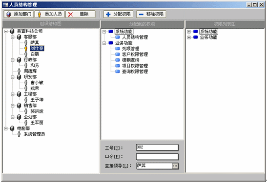 在這一模塊,管理員可以自由設(shè)置人員結(jié)構(gòu)、系統(tǒng)權(quán)限、客戶權(quán)限、查詢權(quán)限等;可以根據(jù)業(yè)務(wù)的需求在數(shù)據(jù)字典里自行添加報表或字段,并且設(shè)定業(yè)務(wù)表之間的關(guān)聯(lián)性;還可進(jìn)行工作流的設(shè)定與分配,等等。