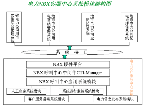 該方案以美國3COM公司的NBX產品為系統(tǒng)平臺,結合其配套的中間件產品CTI-Manager和上層第三方專業(yè)的電力行業(yè)應用系統(tǒng),為各省、市電業(yè)公司建立起新型的電力呼叫中心(Call Center)。使電力客服中心系統(tǒng)以呼叫中心為基礎,以電力系統(tǒng)其他后方資源信息(CIS,DMS,負控等系統(tǒng))為依托,為客戶提供電話、傳真、郵件、Internet等多種接入方式,通過和電力其他業(yè)務系統(tǒng)有機的結合,滿足客戶不同層次、個性化與多樣化的業(yè)務需求,提供了包括錄音、會議電話、統(tǒng)一消息和智能路由在內的多種功能。