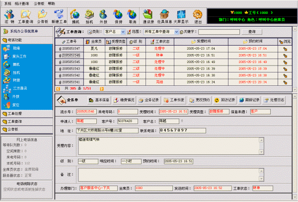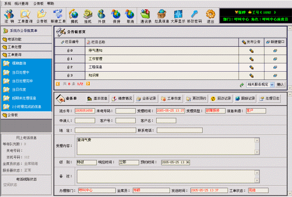系統(tǒng)聯(lián)通了座席員、營業(yè)廳業(yè)務(wù)員、工程管理人員、維修網(wǎng)點派工人員、外勤維修人員、公司管理人員等各種角色使用系統(tǒng)的界面。