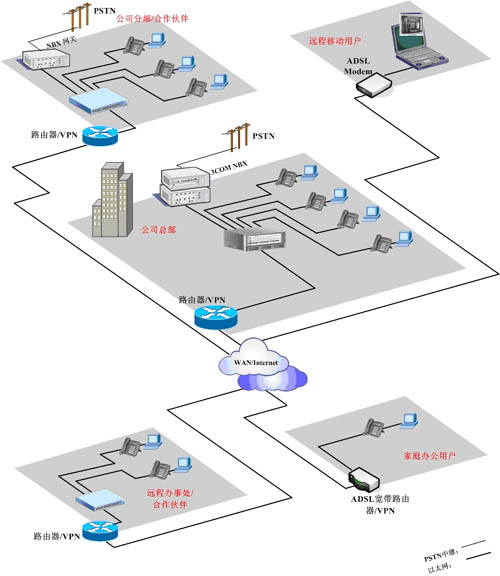 - 采用3COM NBX系統(tǒng)我們可以為用戶(hù)提供移動(dòng)的、靈活的辦公電話(huà)系統(tǒng),本系統(tǒng)的遠(yuǎn)程Internet接入采用ADSL或?qū)>方式。