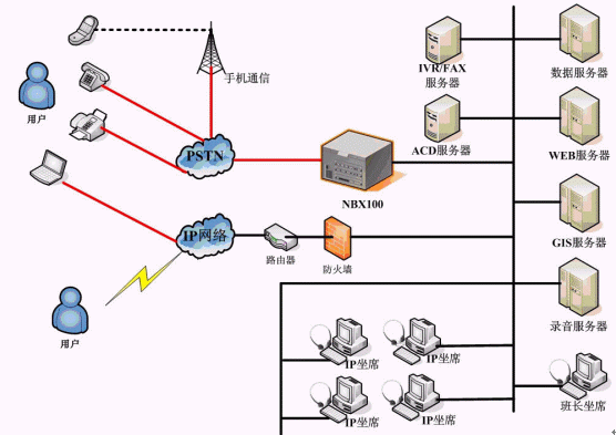 求助中心熱線系統(tǒng)采用華為-3COM 的 NBX100 網(wǎng)絡(luò)交換機作為呼叫接入設(shè)備,基于純IP交換技術(shù),座席電話全部采用IP話機,部署方式靈活。求助中心系統(tǒng)主要負責(zé)受理市民投訴,并派發(fā)到相關(guān)二級網(wǎng)絡(luò)單位;網(wǎng)絡(luò)單位系統(tǒng)主要負責(zé)處理中心下發(fā)的投訴單據(jù),并進行反饋,同時,網(wǎng)絡(luò)單位也可自行受理投訴,并進行相應(yīng)的上傳和下發(fā),多級網(wǎng)絡(luò)單位之間可實現(xiàn)級聯(lián)。為了簡化單據(jù)中轉(zhuǎn)流程,求助中心系統(tǒng)在網(wǎng)絡(luò)派單的基礎(chǔ)上,還結(jié)合自動傳真、短信群發(fā)等技術(shù),提供了自動傳真派單、自動短信派單等多種單據(jù)派發(fā)功能,極大的提高了單據(jù)處理效率。