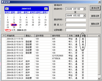 當(dāng)您在接打電話時(shí),可以利用 NBX-TCA對(duì)當(dāng)前的通話進(jìn)行錄音,以方便您對(duì)重要信息的記錄和查找。您可以在通話記錄中對(duì)已錄音的記錄進(jìn)行查找,如下圖所示。打開(kāi)通話記錄,選擇按錄音查找方式查看已有的錄音即可。