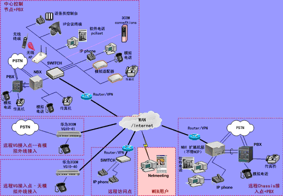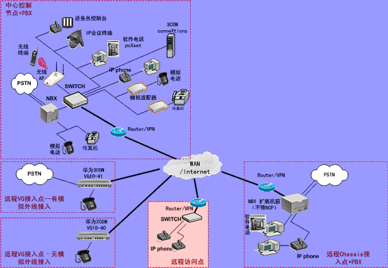 ③.遠(yuǎn)程接入的辦公室不再需要專用的 PBX, 只需要將3Com NBX電話終端接入到WAN網(wǎng)中,就能地實(shí)現(xiàn)在WAN或Internet上與3Com