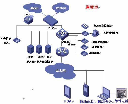 北京市交通應急指揮中心,此次項目采用了1500個設備容量的華為3Com V3000 NBX系統(tǒng)一臺為核心語音調(diào)度交換機,連接PSTN網(wǎng)。使用3101標準版IP智能話機、3102商務版IP智能話機和3105話務臺總數(shù)量達到了34部。在已有的網(wǎng)絡結(jié)構(gòu)中實施語音系統(tǒng),減少對網(wǎng)絡基礎設施的投資,節(jié)省話路設備成本、電話系統(tǒng)安裝、維護和使用管理,還可提供更多的通信業(yè)務和更強的智能語音功能。結(jié)構(gòu)圖如下: