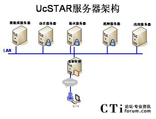 在公司總部部署主UcSTAR服務(wù)器,全國省級分公司分別部署一套子UcSTAR服務(wù)器,組成星型結(jié)構(gòu)公司內(nèi)部的溝通與協(xié)作系統(tǒng)。