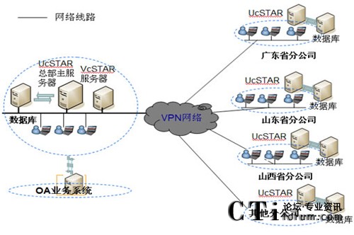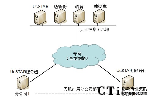 在公司總部部署主UcSTAR服務器,全國省級分公司分別部署一套子UcSTAR服務器,組成星型結構公司內(nèi)部的溝通與協(xié)作系統(tǒng)。