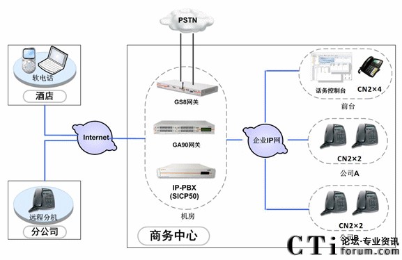 中天凱旋利用企業(yè)內(nèi)部完善的IP通信網(wǎng)絡(luò),在機(jī)房部署SICP系統(tǒng),負(fù)責(zé)整個(gè)語(yǔ)音通信系統(tǒng)的服務(wù)管理、用戶(hù)管理。部署GA90網(wǎng)關(guān)和GS8網(wǎng)關(guān),分別使用E1中繼線(xiàn)路和普通模擬線(xiàn)路接入PSTN網(wǎng)絡(luò),保證系統(tǒng)的通信。