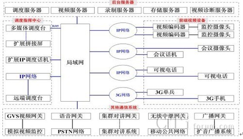 該系統(tǒng)具有傳統(tǒng)視頻監(jiān)控系統(tǒng)、視頻會(huì)議系統(tǒng)、3G單兵系統(tǒng)所不具備的不同視頻設(shè)備、語(yǔ)音通信設(shè)備統(tǒng)一部署和集中管理調(diào)度的能力。為用戶提供了全方位、多業(yè)務(wù)的語(yǔ)音、視頻接入及多媒體指揮調(diào)度整體解決方案。系統(tǒng)連接拓?fù)鋱D如下所示:
