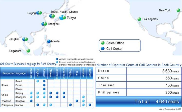 transcosmos的目標是通過擴大服務(wù)回應(yīng)的語言和持續(xù)強化架構(gòu)提供一站式全球呼叫中心服務(wù)來滿足客戶需要。同時,transcosmos通過全球范圍內(nèi)發(fā)展我們的外呼最佳服務(wù)工具“MO3”,已經(jīng)成功在日本、中國和韓國啟動,也積極地作為客戶的全球IT伙伴支持他們的全球發(fā)展。我們的目標是在2011年前海外呼叫中心服務(wù)達到整個transcosmos集團銷售額的10%以及呼叫中心業(yè)務(wù)銷售量的30%。