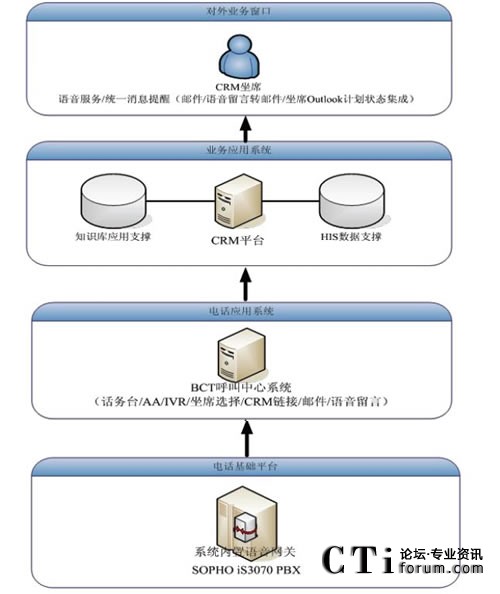 原先電話系統(tǒng)與CRM系統(tǒng)是獨(dú)立的兩個(gè)系統(tǒng),客服人員面對(duì)大量的客戶,迅速的獲悉來電客戶的身份、背景資料以及歷史資料在很大程度上決定了其服務(wù)質(zhì)量。BCT呼叫中心系統(tǒng)位于PBX與CRM之間,作為一個(gè)中間的橋梁,對(duì)PBX送來的電話信息或者用戶輸入的卡號(hào)等數(shù)據(jù)進(jìn)行處理分析,對(duì)主叫號(hào)碼或用戶輸入卡號(hào)進(jìn)行識(shí)別后,傳遞給CRM;CRM檢索與其相連的HIS(醫(yī)院信息系統(tǒng))的數(shù)據(jù)庫(kù),將客戶資料以及相關(guān)的歷史記錄通過彈出網(wǎng)頁(yè)的模式,同步的顯示在坐席的計(jì)算機(jī)上,方便客服代表的輸入和后續(xù)操作,提高了效率與正確率。同時(shí),客戶代表還可以在CRM頁(yè)面中點(diǎn)擊電話號(hào)碼,通過BCT發(fā)起電話呼叫來聯(lián)系客戶,來處理用戶回訪等工作。