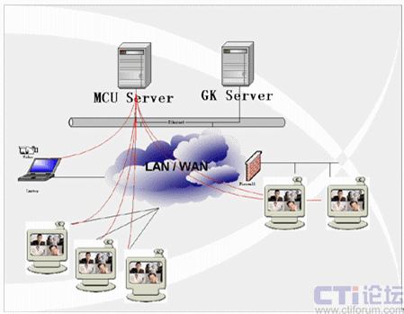 當(dāng)召開多點的交互式會議時則需要MCU(多點控制器)的參與。MCU的作用類似于交換機(jī),主要完成各會場圖像的切換和語音的混音功能,一般放置在主會場。在MCU的控制下可以實現(xiàn)語音激勵、導(dǎo)演控制等多種會議控制方式。