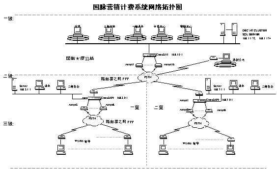 一級(jí)為計(jì)費(fèi)中心,位于國(guó)脈大廈內(nèi),作為整個(gè)系統(tǒng)的運(yùn)行中心和數(shù)據(jù)中心,也是整個(gè)系統(tǒng)的樞紐。二級(jí)主要位于二個(gè)營(yíng)業(yè)室,是整個(gè)系統(tǒng)的分中心。三級(jí)為各營(yíng)業(yè)所和代銷點(diǎn),分散在全市各處是整個(gè)系統(tǒng)的數(shù)據(jù)基礎(chǔ)。