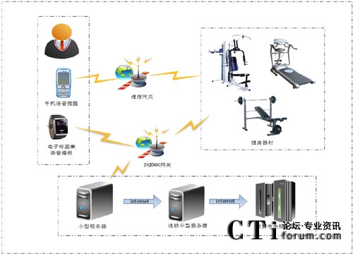 物聯(lián)網(wǎng)關(guān):包括電信網(wǎng)關(guān)和zigbee網(wǎng)關(guān)。電信網(wǎng)關(guān)傳輸短信給客戶手機提醒客戶的健身安排,zigbee網(wǎng)關(guān)應(yīng)用于單個健身房內(nèi),用于傳輸客戶的運動情況和消費信息以及健身器材的使用情況給健身房的服務(wù)器。