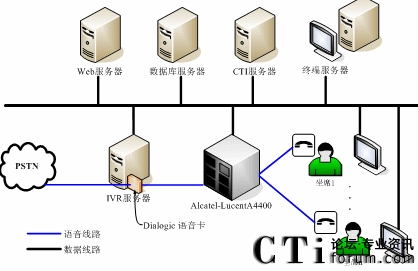 整個呼叫中心分存在兩種通訊方式:語音方式和數(shù)據(jù)方式。語音方式指的是傳統(tǒng)的電話線路,數(shù)據(jù)方式則是指的是各個應(yīng)用程序間的通訊交互線路。管理語音硬件的有Dialogic語音卡—負(fù)責(zé)整個系統(tǒng)的語音接入,并處理自動語音的相關(guān)動作;Alcatel-lucent