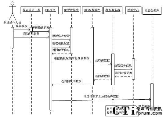 在ETL服務(wù)運(yùn)行時(shí),首先它會(huì)從配置數(shù)據(jù)庫中獲取模板的配置信息,并且根據(jù)其配置信息從ODS源數(shù)據(jù)庫中抽取數(shù)據(jù)。ODS源數(shù)據(jù)庫中的數(shù)據(jù)是狀態(tài)服務(wù)器從呼叫中心中獲得的。在ETL抽取數(shù)據(jù)后對其進(jìn)行轉(zhuǎn)換和加工,將其加載到報(bào)表數(shù)據(jù)庫中。并利用報(bào)表展現(xiàn)工具將報(bào)表數(shù)據(jù)展現(xiàn)出來。其最終設(shè)計(jì)的系統(tǒng)各部件交互時(shí)序圖如圖3.5所示。