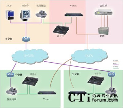 系統(tǒng)基于PSTN電話網(wǎng)絡(luò), 在視頻會(huì)議系統(tǒng)中心會(huì)場(chǎng)配備一套POLYCOM VORTEX EF2241與會(huì)場(chǎng)調(diào)音臺(tái)聯(lián)結(jié),并根據(jù)會(huì)場(chǎng)數(shù)量配備一套相應(yīng)方數(shù)的音頻會(huì)議橋,各分會(huì)場(chǎng)分別配備一套POLYCOM VORTEX EF2211與會(huì)場(chǎng)調(diào)音臺(tái)聯(lián)結(jié),如用戶無線路條件,也可使用當(dāng)?shù)剡\(yùn)營(yíng)商的電話會(huì)議平臺(tái)。