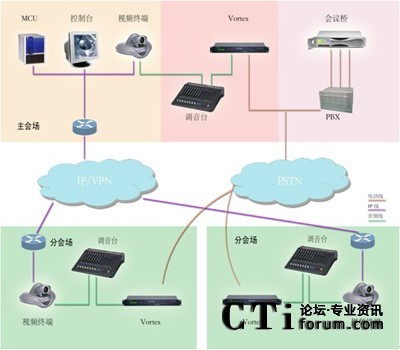 VORTEX 2241或2211與中心會(huì)場(chǎng)的調(diào)音臺(tái)聯(lián)結(jié)),在每個(gè)分會(huì)場(chǎng)根據(jù)會(huì)議規(guī)模分別配備一套POLYCOM會(huì)議電話根據(jù)會(huì)場(chǎng)數(shù)量配備一套相應(yīng)方數(shù)的PSTN音頻會(huì)議橋。