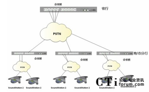 根據(jù)客戶需要在降低會(huì)議成本的前提下實(shí)現(xiàn)快速、便捷、實(shí)時(shí)的多點(diǎn)之間多人會(huì)議溝通的需求,我們制定了以下解決方案;系統(tǒng)利用傳統(tǒng)電話網(wǎng)絡(luò),是客戶擁有自己的會(huì)議管理系統(tǒng);省行方面使用Polycom SS2基本型商務(wù)會(huì)議電話或普通模擬電話;各個(gè)市/縣級分行,根據(jù)自己會(huì)場的情況自選設(shè)備。