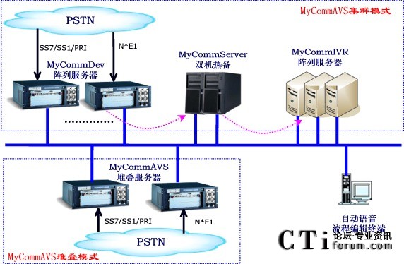 MyCommAVS自動(dòng)語音系統(tǒng)由MyCommDev設(shè)備控制器、MyCommServer核心服務(wù)器和MyCommIVR流程解析器三大核心模塊組成。根據(jù)不同模塊部署方式,可以建議兩大模式方案: