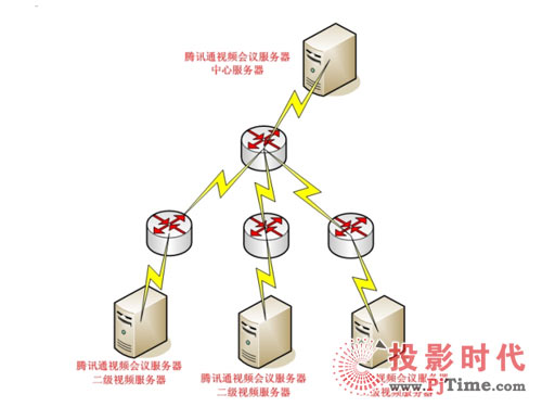 整套視頻系統(tǒng)基于原有IP數(shù)據(jù)網(wǎng)絡(luò),在中心機房建立視騰訊通視頻系統(tǒng)中心服務(wù)器,負責(zé)二級服務(wù)器的連接及控制,用戶數(shù)據(jù)和會議數(shù)據(jù)采用虛擬服務(wù)器管理技術(shù),即在不同的虛擬服務(wù)器的用戶和會議數(shù)據(jù)不能相互看到,當需要召集不同虛擬服務(wù)器用戶的會議時通過管理員進入后臺召集跨虛擬服務(wù)器的會議,以實現(xiàn)各個單位之間的大會議的需求。這樣既能快速召開部門內(nèi)小型視頻會議,同時又能分別在各省市支部召開區(qū)域型的大型會議。