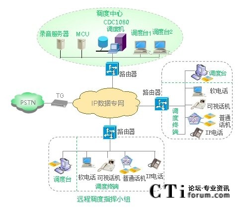 本系統(tǒng)為全I(xiàn)P的開放式體系架構(gòu),由IP調(diào)度機(jī)、調(diào)度臺和調(diào)度終端三部分構(gòu)成。