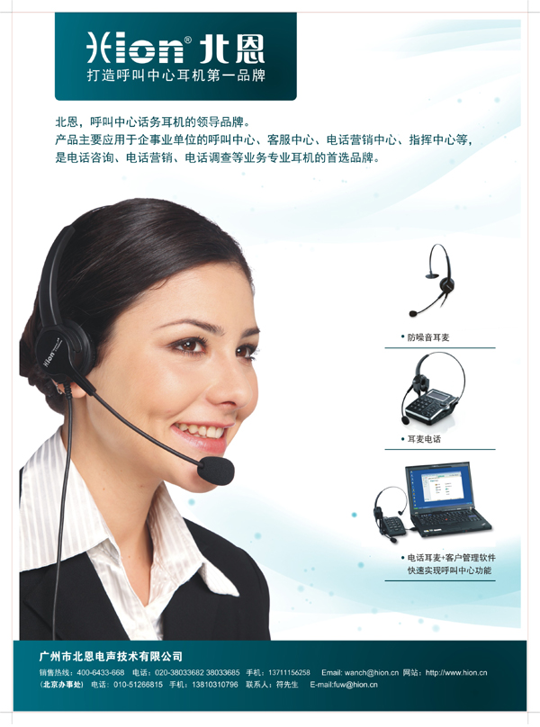 目前北恩Hion耳機品牌已覆蓋全球市場,在北京、上海、廣州、深圳、鄭州、南京設有售后服務中心,并在北美、歐洲、南亞等擁有核心合作伙伴。產(chǎn)品主要應用于電信、金融、電視購物、物流等客服中心以及總機接線員、指揮中心、呼叫中心等,是電話咨詢、電話營銷、電話調(diào)查等業(yè)務專業(yè)耳機首選產(chǎn)品。北恩采用最先進耳機生產(chǎn)技術,制造世界一流的通信耳機,全力打造呼叫中心話務耳機第一品牌。