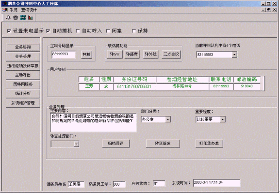 客戶打入電話后,當(dāng)系統(tǒng)的自動(dòng)語音應(yīng)答子系統(tǒng)無法解決客戶問題時(shí),客戶可選擇人工服務(wù),由企業(yè)客戶服務(wù)代表直接接聽客戶電話,處理并解決客戶問題。此時(shí)客戶同座席話務(wù)人員直接溝通,并同時(shí)記錄下該客戶的聯(lián)系方式,將相關(guān)數(shù)據(jù)添加入系統(tǒng)數(shù)據(jù)庫(kù);也可以在數(shù)據(jù)庫(kù)的支持下回答接受查詢卷煙/價(jià)格/限額/新品種、卷煙經(jīng)營(yíng)規(guī)范制度/卷煙專賣政策法規(guī)咨詢、通報(bào)最近暢銷卷煙的限額情況/通報(bào)最近增加的新品種/煙草公司召集的活動(dòng)通知、投訴和舉報(bào)違法經(jīng)銷行為、卷煙預(yù)訂、電話訪銷、滿意度調(diào)查等。