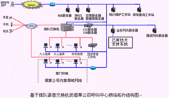 該煙草公司呼叫中心主要是由語音交換機(jī)、CTI服務(wù)器、IVR(交互式語音應(yīng)答)/IFR(交互式傳真應(yīng)答)子系統(tǒng)、人工座席子系統(tǒng)、應(yīng)用服務(wù)器、數(shù)據(jù)庫(kù)服務(wù)器、業(yè)務(wù)網(wǎng)關(guān)子系統(tǒng)、通信網(wǎng)關(guān)子系統(tǒng)等硬件設(shè)備和應(yīng)用軟件組成。