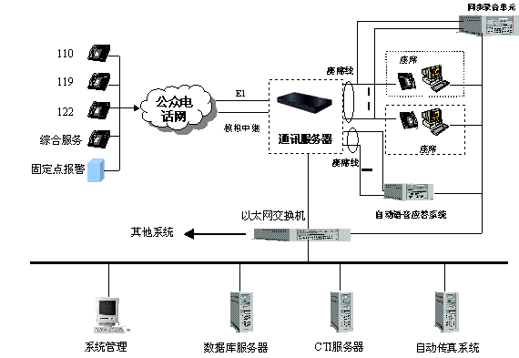 。1).110、119、122報(bào)警電話的傳送與集中接聽模式:所有轄區(qū)以內(nèi)的110、119、122報(bào)警電話都經(jīng)市電信局統(tǒng)一匯接,通過一條PCM2MBPS數(shù)字中繼送往市局指揮中心hxd09可編程智能語音交換機(jī)(簡稱交換機(jī),下同)。再由交換機(jī)經(jīng)過數(shù)模轉(zhuǎn)換、排隊(duì)分配等處理后送往指揮中心各受理臺(tái)。此外,系統(tǒng)還備用了4條專用的模擬中繼線,用于當(dāng)PCM數(shù)字鏈路發(fā)生意外時(shí),作為傳送110、119、122報(bào)警電話的應(yīng)急備用專線。
