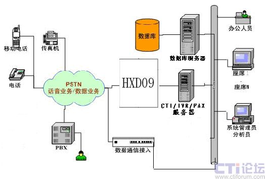 “系統(tǒng)”主要由以下幾部分組成:HXD09語音交換機(jī)、CTI Server服務(wù)器、數(shù)據(jù)庫系統(tǒng)、業(yè)務(wù)處理系統(tǒng)以及座席(業(yè)務(wù)代表)、呼叫管理系統(tǒng)、呼叫監(jiān)控系統(tǒng)幾項業(yè)務(wù)組成。