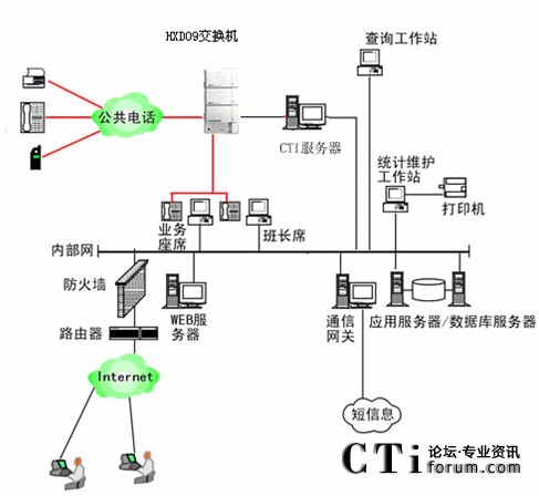 本系統(tǒng)物理結(jié)構(gòu)HXD交換機、CTI服務(wù)器、IVR(交互式語音應(yīng)答)/IFR(交互式傳真應(yīng)答)服務(wù)器、業(yè)務(wù)代表座席(邏輯上分為:普通業(yè)務(wù)代表座席、專家座席等)、班長座席、統(tǒng)計維護管理工作站、因特網(wǎng)(WEB)服務(wù)器、數(shù)據(jù)庫/應(yīng)用服務(wù)器、錄音工作站、網(wǎng)絡(luò)系統(tǒng)等構(gòu)成。