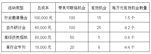 從前面的分析中,我們?cè)?jīng)談到過(guò):市場(chǎng)的核心是用最低的成本,幫助企業(yè)把目標(biāo)客戶推動(dòng)成為機(jī)會(huì)客戶。那么,同樣成本推動(dòng)為有效機(jī)會(huì)客戶數(shù)量的多少,則是評(píng)價(jià)市場(chǎng)方案的有效模型。當(dāng)然,針對(duì)個(gè)人消費(fèi)市場(chǎng),似乎可以用更加簡(jiǎn)單的投入產(chǎn)出比進(jìn)行分析,一種類型的市場(chǎng)投放運(yùn)作,在一定時(shí)間內(nèi)帶來(lái)的業(yè)績(jī)收益與成本的比較,可以方便地了解到不同類型市場(chǎng)投放的效益對(duì)比;而對(duì)于大部分需要有銷售過(guò)程的機(jī)構(gòu)消費(fèi)客戶,我們可以參考以下我們對(duì)劉總公司拿出的模型示例: