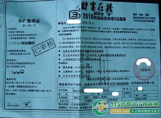 會場到處都洋溢“中國聯(lián)通”的氣息。如現(xiàn)場有眾多中國聯(lián)通的3G宣傳廣告,且發(fā)的材料中還有一份是中國聯(lián)通的宣傳單,另外,會議現(xiàn)場甚至還有聯(lián)通3G手機(jī)銷售柜臺。種種情況讓齊先生等人更堅定了他們參加的就是中國聯(lián)通組織的會議。
