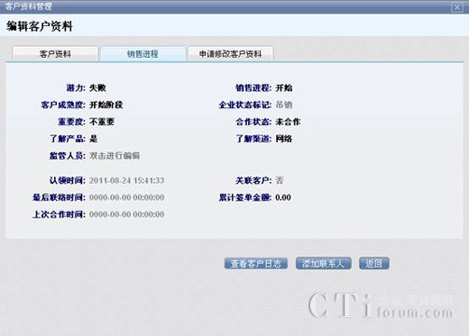 點擊標(biāo)簽選擇要查看的客戶資料,和銷售進程。查看客戶日志能看到該客戶被執(zhí)行操作的歷史情況,例如資料的變更,所屬的變更等等。添加聯(lián)系人是指為當(dāng)前客戶添加新的聯(lián)系人,添加完聯(lián)系人信息后,聯(lián)系人就會被納入到該客戶資料里。