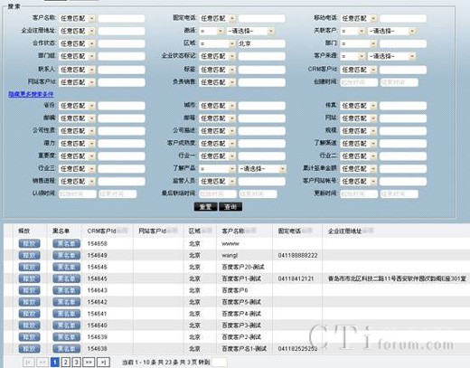例如,以區(qū)域為條件進行搜索,區(qū)域選擇北京后,點擊查詢,你想要的北京區(qū)域的客戶全部出現(xiàn)在客戶列表中。