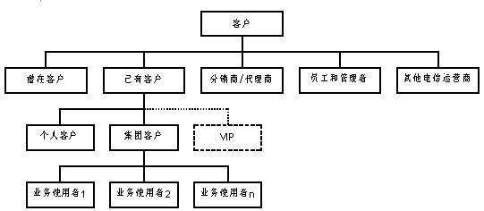 同時(shí),客戶服務(wù)中心的服務(wù)對(duì)象進(jìn)一步擴(kuò)大,按照是否已經(jīng)使用該電信運(yùn)營(yíng)商提供的電信業(yè)務(wù)將客戶劃分為:潛在客戶、已有客戶。這里的潛在客戶并不針對(duì)某一具體的電信業(yè)務(wù),而是針對(duì)電信運(yùn)營(yíng)商整體而言。其中,已有客戶又分為個(gè)人客戶和集團(tuán)客戶。集團(tuán)客戶內(nèi)部存在多個(gè)業(yè)務(wù)使用者,這些業(yè)務(wù)使用者本身也是客服系統(tǒng)的客戶。分銷/代理商代為發(fā)展電信運(yùn)營(yíng)商的客戶,同時(shí)他們也可以單獨(dú)作為一種特殊客戶享有客服系統(tǒng)提供的服務(wù)。在個(gè)人客戶和集團(tuán)客戶中,均會(huì)有一部分成為特殊的VIP。此外,對(duì)客服系統(tǒng)來說,電信運(yùn)營(yíng)商的員工和管理者也是"客戶";同時(shí),從網(wǎng)間互聯(lián)和網(wǎng)間結(jié)算的角度,其它運(yùn)營(yíng)商也應(yīng)該按照客戶來對(duì)待。